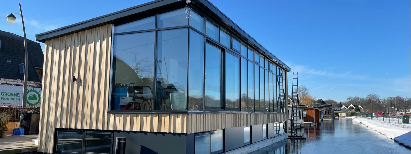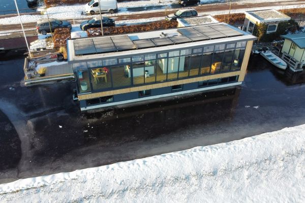 Deze nieuw gebouwde woonark is volledig gasloos. Er is extra aandacht besteed aan de basis isolatie met 18cm dikke PIR platen, triple glas en geïsoleerde bak. Verwarming gebeurt middels een stille REMKO Warmtepomp gekoppeld aan een 1.000 Liter combi Boiler/Buffer. Energie wordt opgewekt met Duitse Glas/Glas panelen gekoppeld aan een innovatieve Zweedse DC omvormer die zorgt voor Fase balancering om de aansluitwaarde zo klein mogelijk te houden. De Omvormer laadt de 11kW accu die wordt opgesteld. De Laadpaal op eigen terrein zorgt er voor dat de auto direct op zonne energie wordt geladen. Daarnaast is de laadpaal voorzien van Dynamic Load Balancing zodat er in combinatie met de slimme meter nooit meer stroom gebruikt wordt dan dat de aansluiting groot is.
