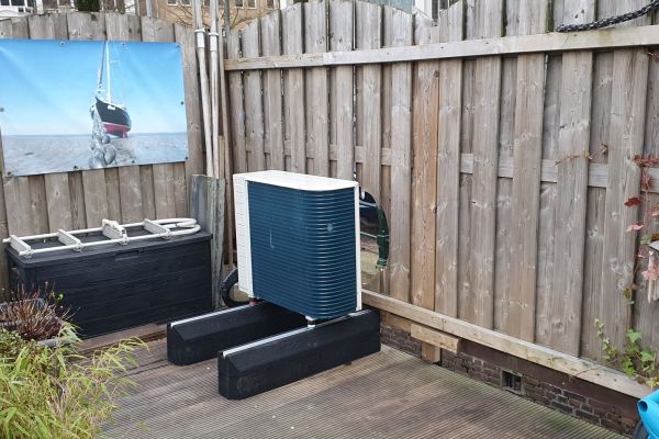 Sinds begin 2022 geplaatst: 8 zonnepanelen (zinvol aantal wegens zon-ligging): en een hybride warmtepomp van Daikin – Intergas: Binnenunit moest in bestaande kleine ruimte worden ingebouwd. Buitenunit op rubbers >terrasdek en maakt nauwelijks geluid!