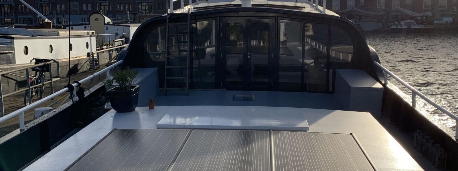 Groot woonschip (voormalige viskotter uit 1958) is in 2017 in eigen beheer volledig verbouwd tot energieneutrale woning, met warmtepomp (water-water), WTW luchtventilatie, pv-panelen, zonneboiler, grijswatersysteem, wateronthardingsunit en natuurlijk goede isolatie rondom.