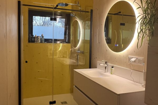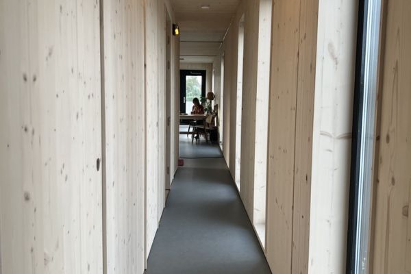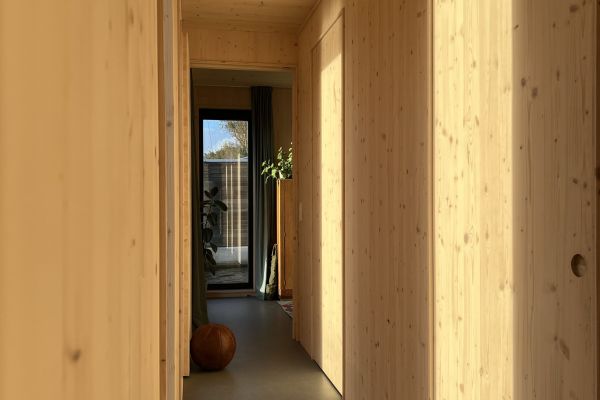 Wanden 45 cm Houtvezel isolatie ingeblazen, binnenwanden van CLT-hout. Vloer en palfond 30 cm houtvezel isolatie