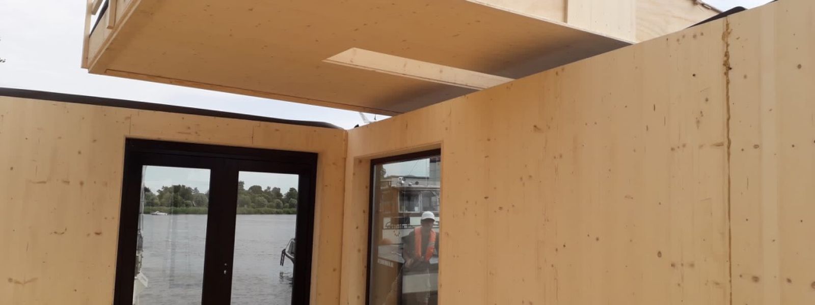 Nieuw gebouwde woonark modulair CNC-gefreesd, biobased gebouwd. Veel aandacht voor passieve manier van bouwen, tripple glas, 45cm houtvezel geïsoleerde wanden, vloer en en dak, houten spijkers bij plaatsing binnenwanden, wtw-systeem en zonnepanelen. Infrarood verwarming.