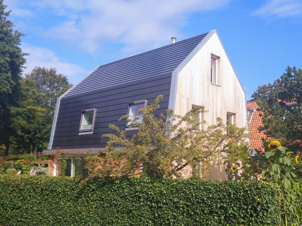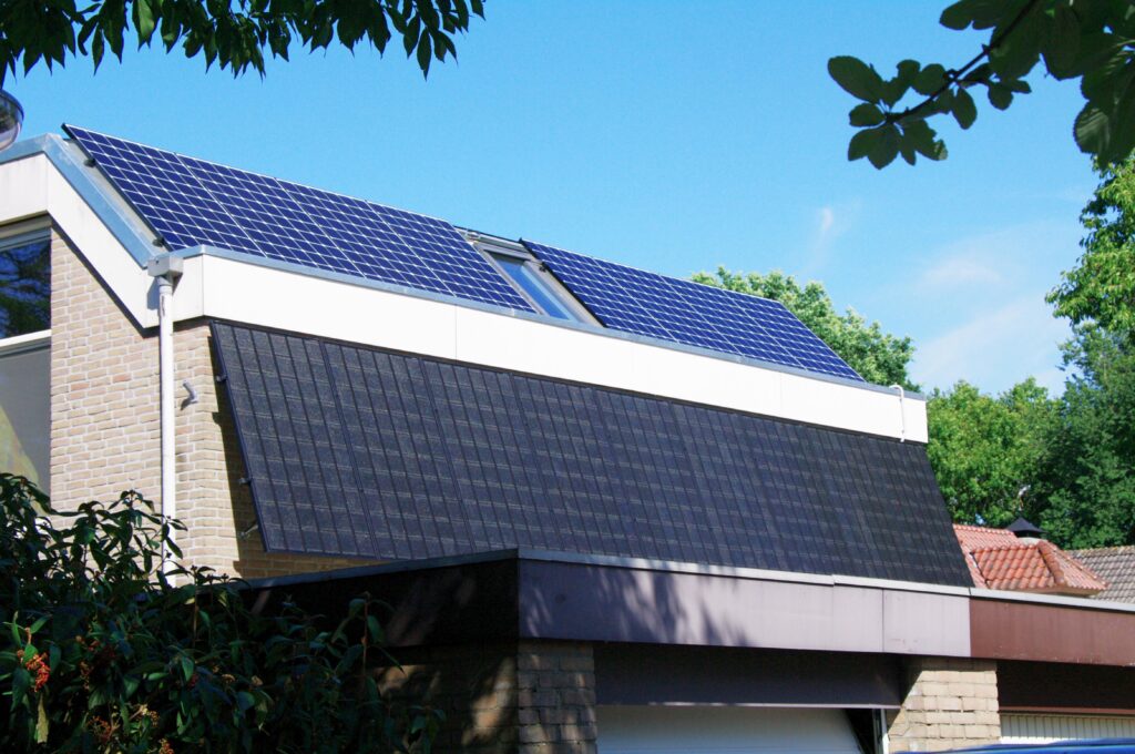 Nieuwbouwwoning met zonnepanelen, warmtepomp, boilervat en zonnecollector.