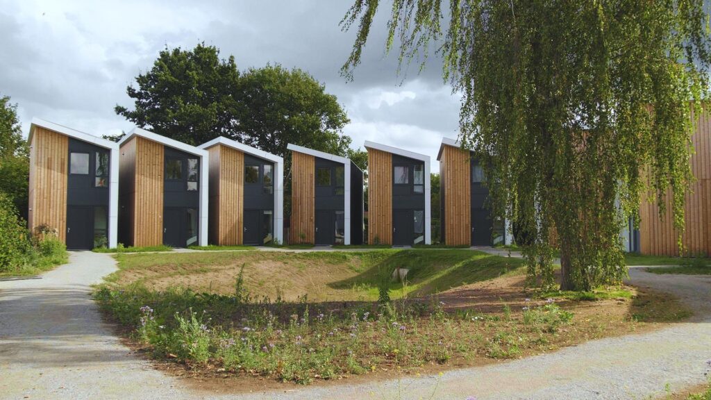 De woning staat op een project van tien woningen: tien duurzame, kleinere, prefab woningen. Energieneutraal en sommige nul-op-de-meter. Prefab houtbouw,...