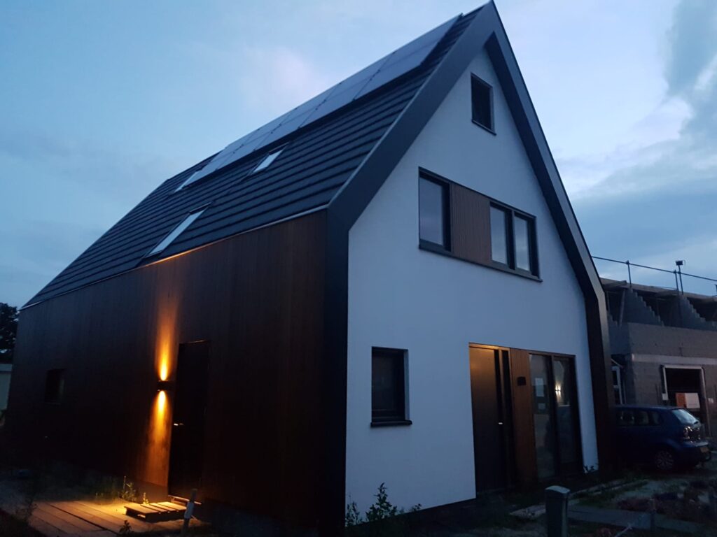 Volledig zonnendak, warmtepomp met grondlus, groendak, regenwaterberging, infiltratie duurzame houtenkozijn, gevelbekleding en volledige ledverlichting.