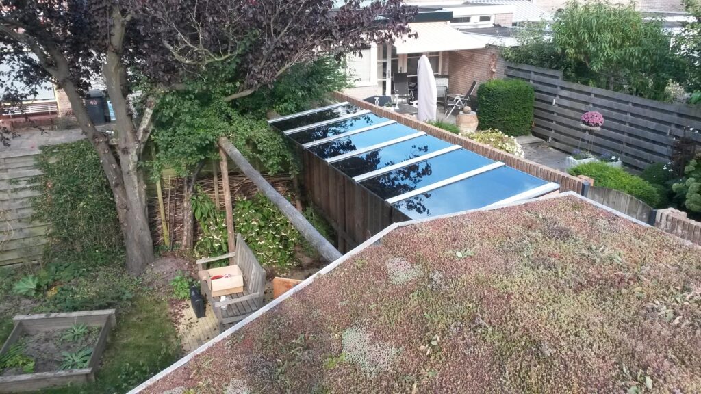 Nu ook lichtdoorlatende zonnepanelen als veranda/afdak achter in de tuin: schaduw, afdak en ook nog elektriciteit produceren. Wat wil je...