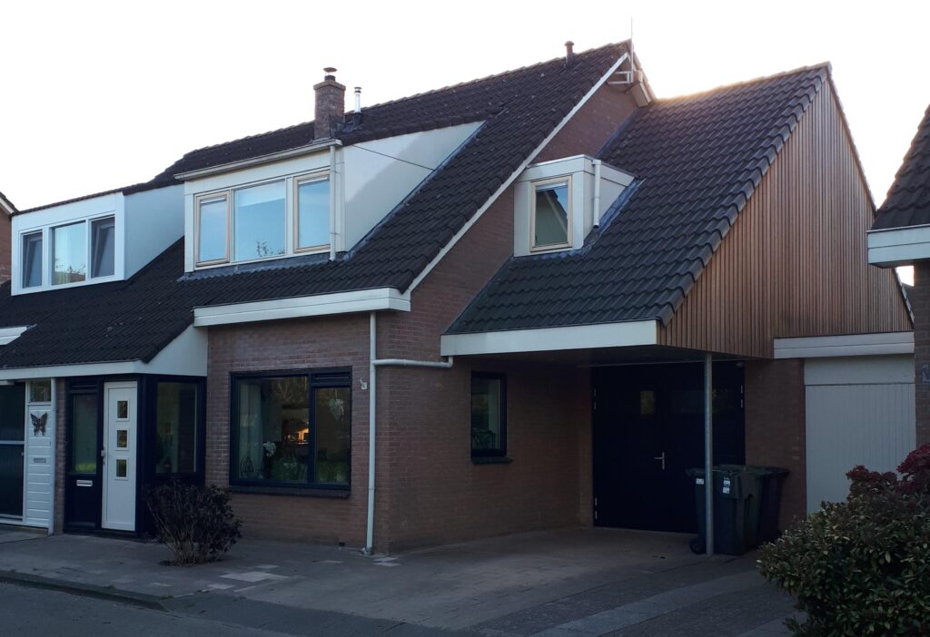 Bestaande 2-onder-1 kap woning bouwjaar 1985 met een energieneutrale oplossing (NOM). Dubbelglas vervangen door HR++ glas, spouwmuren geïsoleerd met Thermisch isolerende spouwmuurvulling...